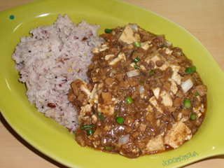 写真は御飯の上にかけて麻婆豆腐丼のようにしたもの。御飯は雑穀入り。今日は友人を呼んでいたので、4人分で作成。香辛料類は好みで加減してOK。味は好評だったようで良かった。一応麻婆豆腐は私の十八番なのだが、当ブログを書き始めてから初の麻婆豆腐が今日のだった。