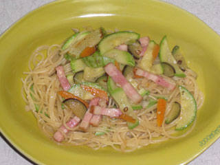 木曜に続き、サンキュウ農園のお試しセットに入っていた野菜で作ったパスタ。今回はズッキーニが主役。小ナスとニンジン、にんにくもサンキュウ農園のものを使用。