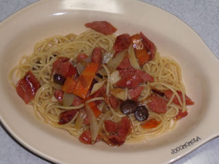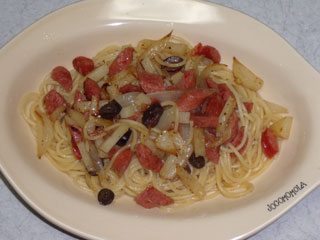 にんにく抜きで作るチョリソーとブラックオリーブのアンチョビ風味パスタ