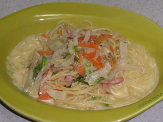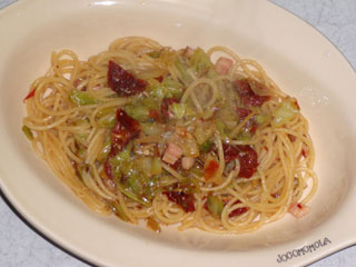 キャベツとベーコンのイタリアンラー油入りパスタ
