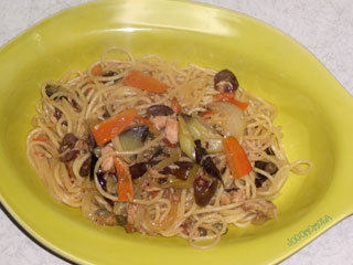 野菜に火が通ったら、塩、コショウ、ブラックオリーブ、ケッパー、輪切り赤唐辛子、アンチョビ、ツナを入れてざっと混ぜ合わせる