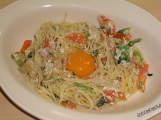 朝食を用意してくれた相方がソーセージを2本余らせたので、ソーセージを使い切ってほしいというリクエストを受けて作ったレシピ。ところが、出来上がり間際を見ての相方の悲鳴。「え~~~、豆乳~~~?」