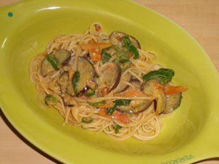 ナスとピーマンのマヨ味噌豚キムチそぼろパスタ