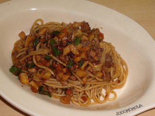 挽肉とたけのこの甜麺醤炒めパスタ・食べるラー油入り