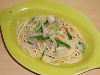 パスタ茹で上がり1分前にタマネギを鍋に入れ、一緒に茹でる