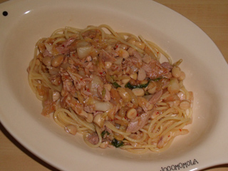 ・塩、コショウ、ツナを入れて加熱しながら混ぜ、茹で汁の水分があらかた飛んだら皿に盛り付けて出来上がり