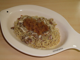 以前ゴボウをささがきで使ってパスタへのからみがイマイチだった経験をもとに、ニンジンをピーラーで薄く切り出したものを使ってみた。結果、程好くパスタにニンジンがからみ、味もバッチリだった。