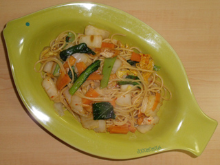 色々野菜と油揚げ入りの豆板醤風味パスタ