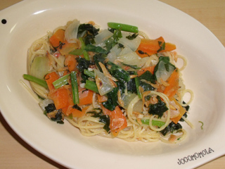 ・パスタ茹で上がり1分前に小松菜を投入し、一緒に茹でる