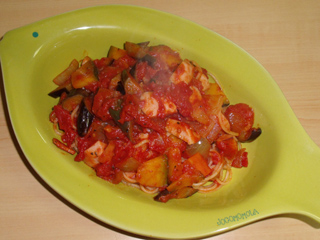 カボチャとナスのラタトゥイユ風トマトソースパスタ