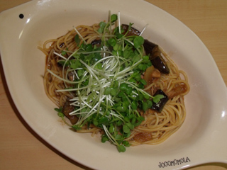 ナスとツナの甜麺醤ソースパスタ・カイワレ乗せ