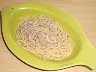 ・標準茹で時間よりやや短めに茹でたパスタをフライパンに入れ、粉末パルメザンチーズ、ツナ、塩、コショウ(お好みで粉末バジル、粉末パセリ)も入れて加熱しながら混ぜ合わせる