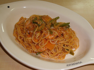 ・先程取り出しておいたエビをフライパンに入れて加熱しながら全体を混ぜ合わせ、トマトソースがパスタに馴染んだら皿に盛り付けて出来上がり