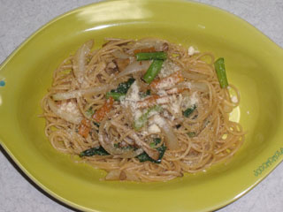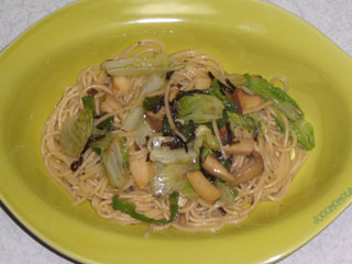 レタスの余りをパスタに使ってみようと思い、こんなのが出来上がった。しゃきっと感を残したかったら、レタス投入は仕上がり間際でもいいかも。