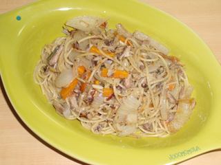 キャベツとイカの塩辛のパスタ