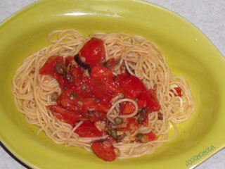 冷製パスタなのにフライパンを使ってひと手間、というのをやってみた。加熱時間はどれくらいが丁度良いのかは、まだ試行錯誤段階。具材の内容はプッタネスカに近いので、ハズレにはなりにくい、はず。多分。