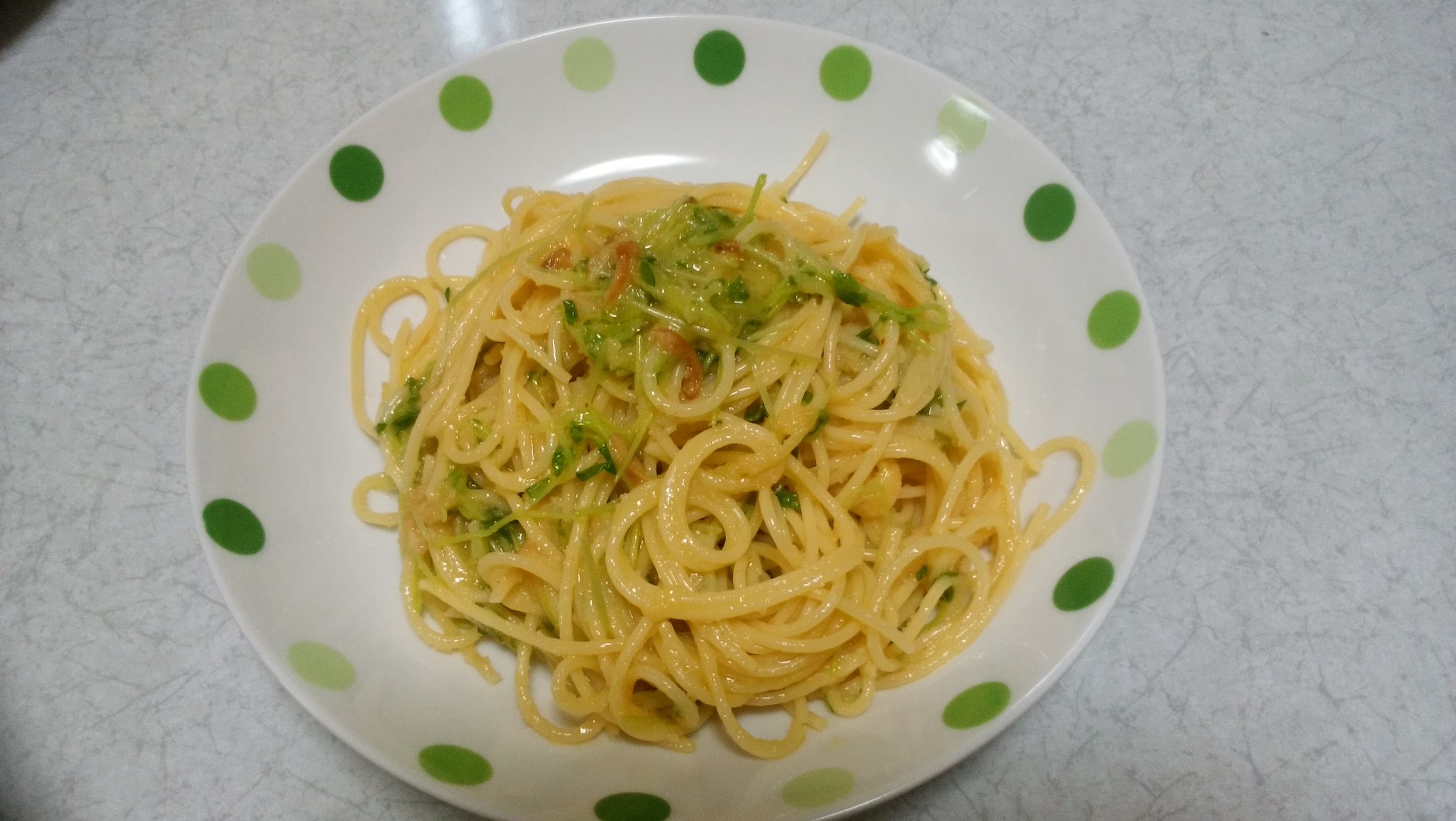 よく混ざったら豆苗と茹で上がったパスタをフライパンに入れてさらに混ぜる。
