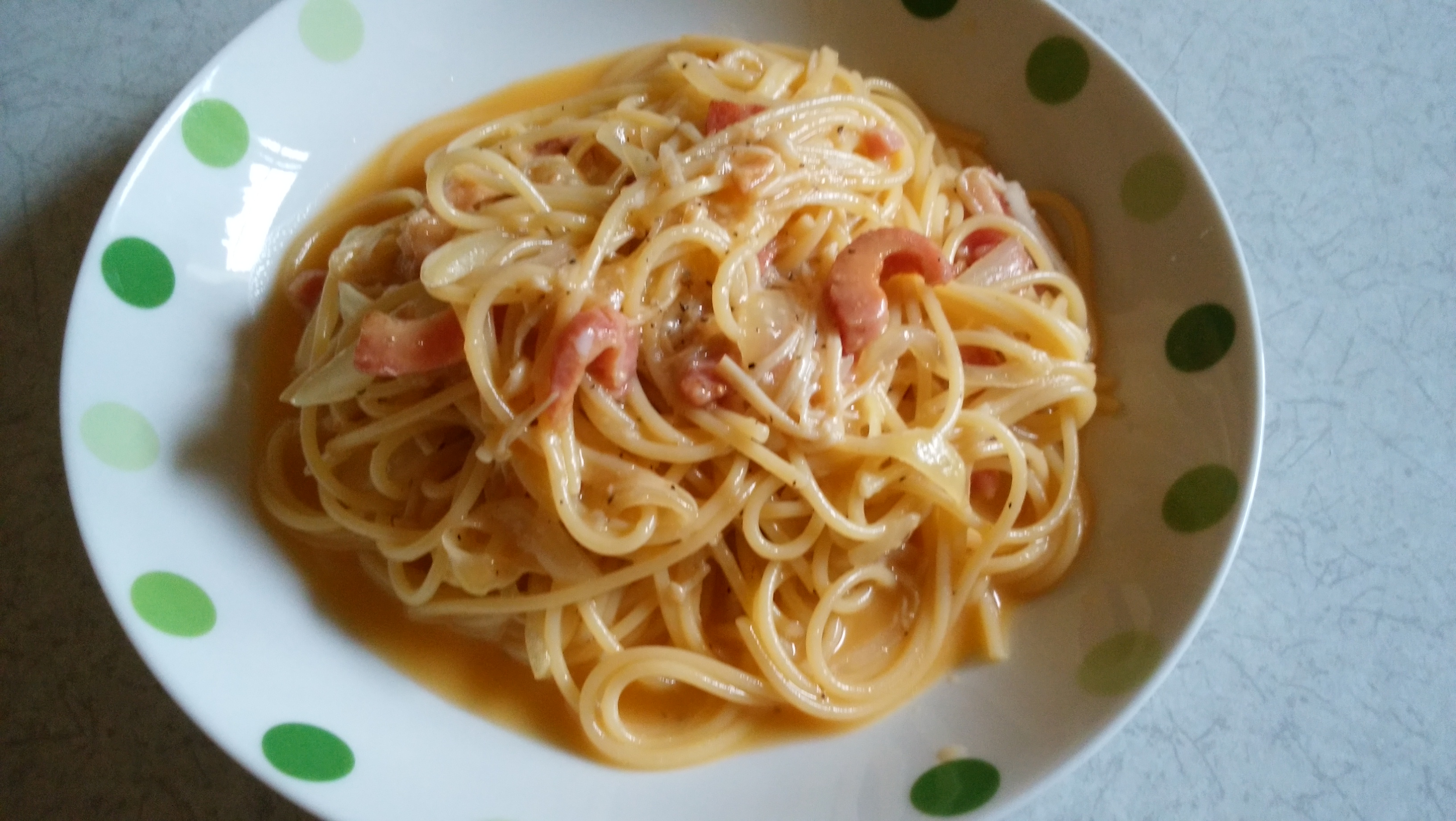 茹で上がったパスタとコショウをフライパンに入れてとろ火にかけながら全体を混ぜ、卵にとろみがついてきたら皿に盛り付けて出来上がり。