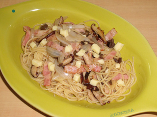 しいたけとベーコンのアーリオオーリオ・チーズ乗せ