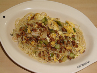 スクランブルエッグと納豆と糠漬けのパスタ