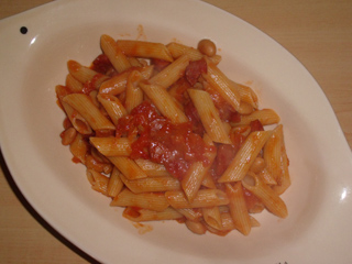 トマトと大豆を煮込んだやつ(相方が作ってくれたもの)を使って作ったペンネ