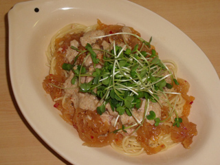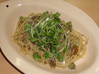 覚えていない・・・多分、アボカドとオイルサーディンで何かしたパスタに貝割れ大根がトッピングされたもの