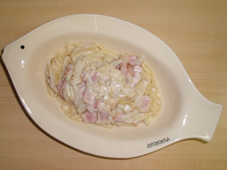 ・混ぜ混ぜしてホワイトソースがパスタに馴染んだら皿に盛り付けて出来上がり