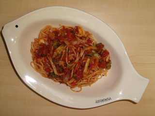 ・フライパンに火を点け、トマトソースがパスタ全体に馴染んだら皿に盛り付けて出来上がり