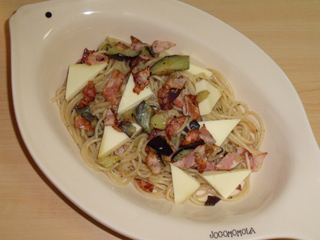 ・塩、コショウ、バジルを入れて加熱しながら混ぜ、茹で汁があらかた蒸発したら皿にパスタから盛り付け、その上にチーズを乗せてから具を乗せて出来上がり