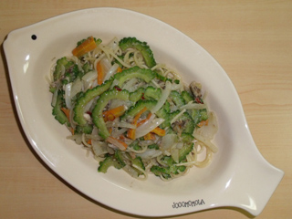 ゴーヤとオイルサーディンのペペロンチーノ