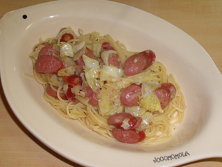 ・キャベツとタマネギを食べやすい大きさにカット、チョリソーは斜めにスライス