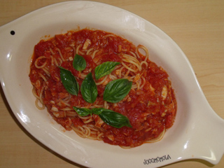 にんにく多め、バジルは生。かなり主張の強い味同士が合わさったパスタ。トマトソースの隠し味にタバスコと中濃ソース(ウスターソースで代用してもよい)を使うのは私の定番。タマネギも含め、旨味たっぷり。生のバジルはかなり香味が強いので、苦手な方は乾燥粉末バジルを使う、もしくはバジル抜きにしてもよい。
