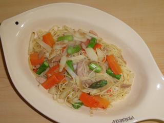 ・パスタの茹で上がり1分前にアスパラガスを鍋に入れ、一緒に茹でる