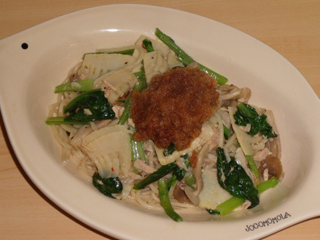 以前作ったペペロンチーノ大根おろし乗せのアレンジ。んまかった。これ結構いいかも。大根おろすのが面倒だけど。