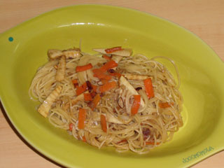 加熱しながら混ぜ、茹で汁の水分があらかた飛んだら皿に盛りつけて出来上がり