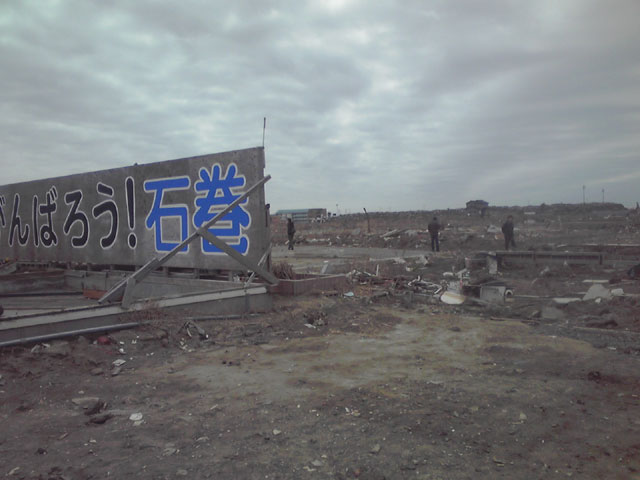 看板の背景から目を逸らさないでいただきたい。これが被災地の現状。